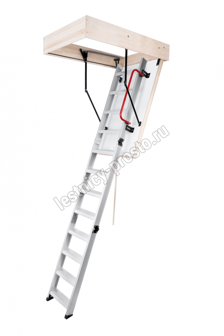 Складная 4-х секционная чердачная лестница. Рабочая поверхность полностью выполнена из алюминия. Термоизоляционная крышка типа "сэндвич" имеет усиленную теплозащиту, облицована с двух сторон ДВП белого цвета. По контуру короба имеется уплотнитель; Все металлические элементы лестницы покрыты порошковой краской.