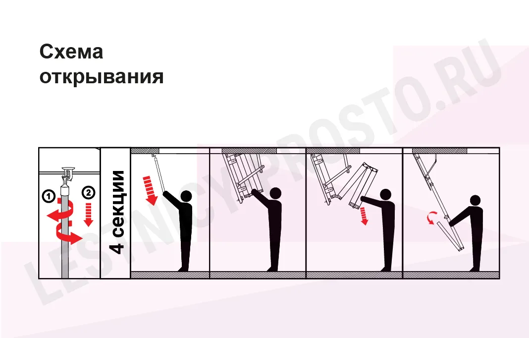 Лестница складная четырехсекционная, изготовлена из массива сосны. Термоизоляционная крышка типа "сэндвич" утеплена пенопластом толщиной 20 мм, облицована с двух сторон ДСП белого цвета