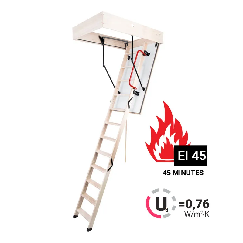 Лестница складная трехсекционная. Рабочая поверхность полностью выполнена из металла и покрашена порошковой краской. Термоизоляционная крышка типа "сэндвич", толщиной 47 мм, утеплена пенопластом, облицована с двух сторон ДCП белого цвета.
