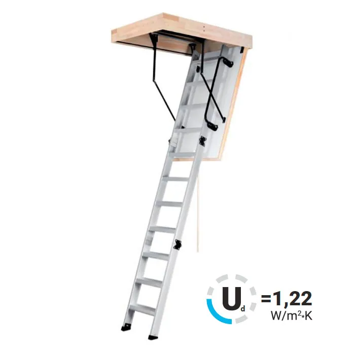 Лестница EI45 POLAR отличается тройным уплотнением, включая одинарное противопожарное уплотнение и люк толщиной 86 мм. Крышка люка утеплена пенопластом, облицована с двух сторон ДСП белого цвета.