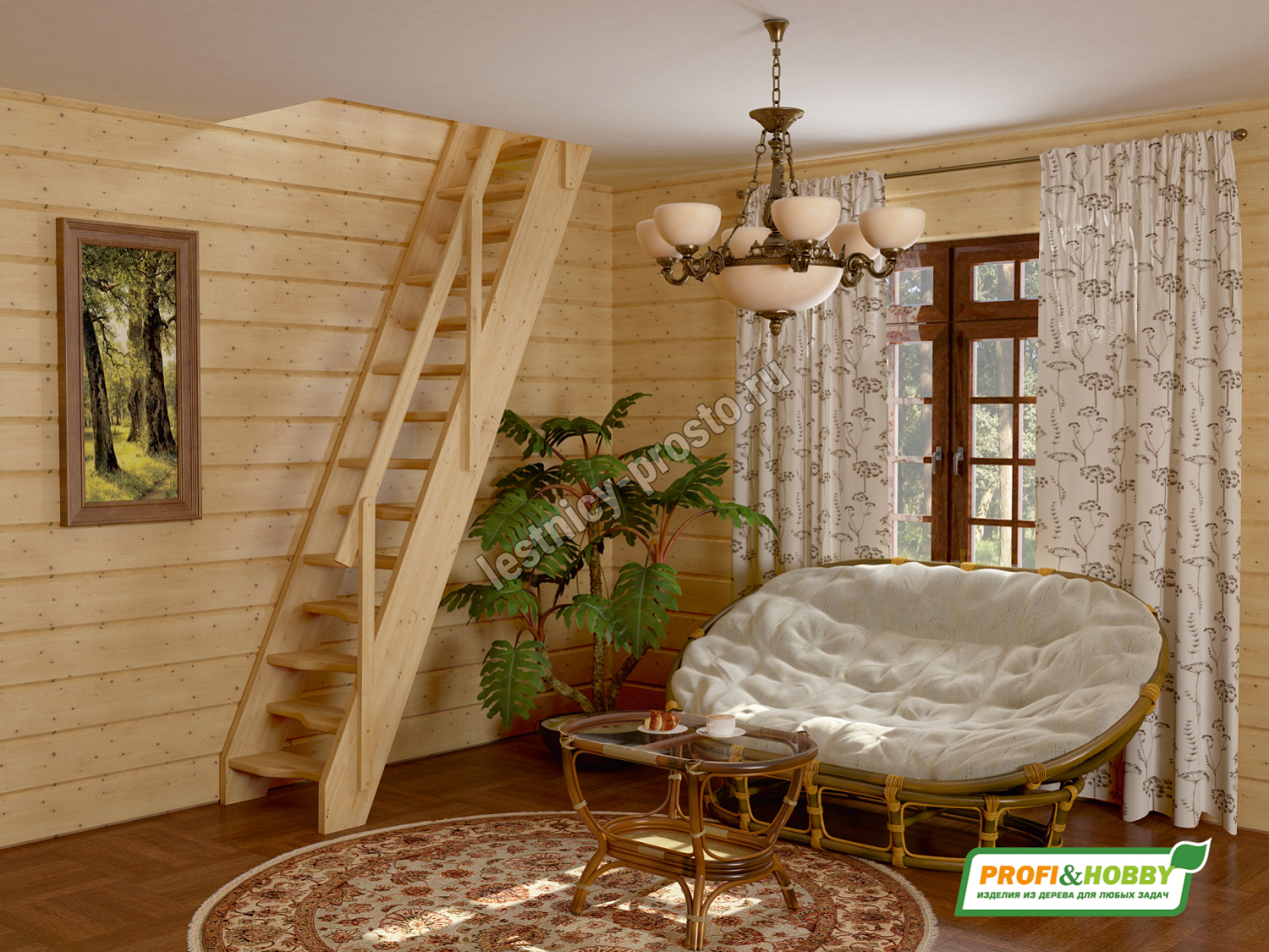 Ступени и поручень лестницы изготовлены из бука, остальные элементы из сосны.