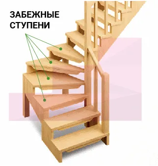 Забежные ступени ступени с более широким внешним краем и более узким внутренним. Используются для изменени для плавного изменения направления движения по лестнице, могут заменять промежуточную площадку, помогают уменьшить габариты конструкции.
